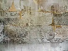 Le décor apparait en bas-reliefs ou en hauts-reliefs, tapissant plus ou moins toutes les surfaces des tympans, les parties hautes des pilastres et bien des parties plates entre les pilastres ainsi que les galeries, quand il y en a, comme celles d'Angkor Vat. La sculpture se fait en trois temps : un sculpteur exécute les grandes lignes. Une équipe vient alors ébaucher les formes. Enfin des sculpteurs hautement qualifiés vont parachever le travail[51]. Ces ateliers de sculpteurs travaillent en permanence sous l'autorité et la protection du monarque[52].