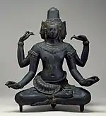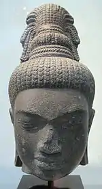 À la suite de cela, probablement par une mutation interne[33], le Founan au cours du VIe siècle devient le royaume du Chenla[34] qui contrôlait à peu près le même territoire mais aussi au-delà, plus au Nord-Ouest. Mais, après morcellement, le « Chenla d'eau », au Sud et sud-ouest, se serait séparé d'un « Chenla de terre », dans le nord-est. La capitale du « Chenla d'eau », Isanapura, aujourd'hui Sambor Prei Kuk, a été fondée en 618 par le roi Içanavarman Ier dans l'actuelle province de Kampong Thom. Elle se trouvait ainsi dans la région d'Angkor, mais Óc Eo faisait encore partie de ce royaume. Cependant moins qu'un contrôle d'un vaste territoire sur ses voisins il semble que l'autorité, le prestige, aient déterminé des rapports d'allégeance[35] acceptée de la part d'autres entités politiques de tailles similaires à l'égard de la plus prestigieuse d'entre elles. Les premiers dieux coiffés d'une mitre, aux VIe – VIIIe siècle, aux traits physiques si naturalistes, pourraient évoquer ces souverains prestigieux "divinisés"[36].