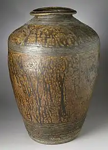 - Les jarres de stockage khmères sont identifiées dès la fin du IXe siècle dans les environs de la ville d'Angkor, en terre cuite, la plupart sans glaçure, dont l'aspect est semblable à celui des jarres chinoises Tang. La lèvre se transforme au cours du XIe – XIIe siècle. Puis, entre le XIIe et le XIVe siècle, un second site de fours, à 50 km au nord d'Angkor, produit de grandes jarres à glaçure brune. Les sites de fours de Choeung Eck, près de Phnom Penh et Ban Kruat en Thaïlande produisaient des jarres non glaçurées. Pour l'ensemble, la production est considérable mais s'est limitée à un usage au sein de l'empire khmer, jamais pour l'exportation. Les plus grandes pouvant atteindre 60 cm, à l'épaule [75].
