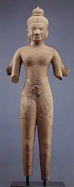 À propos du bodhisattva Maitreya en bronze du Musée national du Cambodge, ce bodhisattva n'est jamais figuré par une ronde-bosse en grès, alors qu'à l'inverse il l'est souvent en bronze. Les divinités représentées en bronze sont d'ailleurs bien plus nombreuses que celles en pierre. Néanmoins les codes de représentation plastiques (ici, style du Bakeng ?) et vestimentaires y sont les mêmes[62].