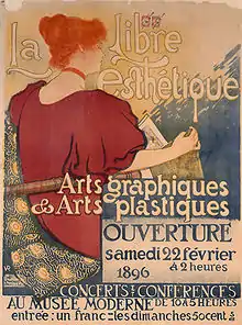 À Bruxelles, il existe un milieu d'avant-garde à la recherche de nouveauté capable de faire pièce à l'historicisme triomphant. Un ensemble de mécènes et d'artistes connu sous le nom de Groupe des XX qui « répondait aux théories de Viollet-le-Duc »[26] organise à partir de 1884 des expositions regroupant des artistes refusés par les salons officiels. Ce groupe est peut-être le premier à intégrer au sein d'une exposition de peinture et de sculpture des objets d'art décoratif. Ce mouvement est très influencé par des penseurs et artistes anglais, tels que William Morris, James Abbott McNeill Whistler ou Aubrey Beardsley ainsi que par l'art japonais. Il poursuit la même activité après 1894 sous le nom de La Libre Esthétique[27].