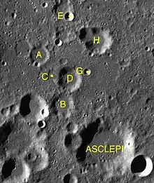 Les cratères dits satellites sont de petits cratères situés à proximité du cratère principal, ils sont nommés du même nom mais accompagné d'une lettre majuscule complémentaire (même si la formation de ces cratères est indépendante de la formation du cratère principal). Par convention, ces caractéristiques sont indiquées sur les cartes lunaires en plaçant la lettre sur le point le plus proche du cratère principal. Liste des cratères satellites de Asclepi[5] :