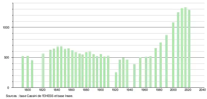 L'évolution du nombre d'habitants est connue à travers les recensements de la population effectués dans la commune depuis 1793. Pour les communes de moins de 10 000 habitants, une enquête de recensement portant sur toute la population est réalisée tous les cinq ans, les populations légales des années intermédiaires étant quant à elles estimées par interpolation ou extrapolation[19]. Pour la commune, le premier recensement exhaustif entrant dans le cadre du nouveau dispositif a été réalisé en 2006[20].