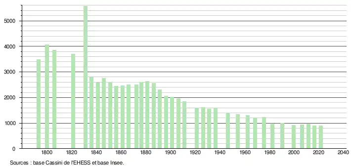 - Population municipale légale en vigueur au 1er janvier 2024, millésimée 2021, définie dans les limites territoriales en vigueur au 1er janvier 2023, date de référence statistique : 1er janvier 2021.