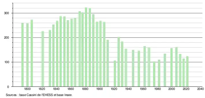 L'évolution du nombre d'habitants est connue à travers les recensements de la population effectués dans la commune depuis 1793. Pour les communes de moins de 10 000 habitants, une enquête de recensement portant sur toute la population est réalisée tous les cinq ans, les populations légales des années intermédiaires étant quant à elles estimées par interpolation ou extrapolation[22]. Pour la commune, le premier recensement exhaustif entrant dans le cadre du nouveau dispositif a été réalisé en 2006[23].