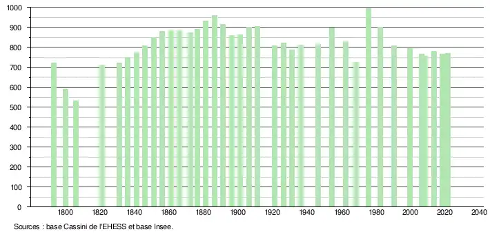 L'évolution du nombre d'habitants est connue à travers les recensements de la population effectués dans la commune depuis 1793. Pour les communes de moins de 10 000 habitants, une enquête de recensement portant sur toute la population est réalisée tous les cinq ans, les populations légales des années intermédiaires étant quant à elles estimées par interpolation ou extrapolation[23]. Pour la commune, le premier recensement exhaustif entrant dans le cadre du nouveau dispositif a été réalisé en 2008[24].
