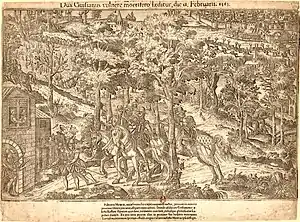 Au point culminant du siège d'Orléans en 1563, le protestant Jean de Poltrot de Méré tend une embuscade au duc François de Guise et l'assassine d'un coup de feu[17],[18]. Sous la torture, Poltrot implique Coligny, Soubise ou Théodore de Bèze comme instigateurs de l'assassinat, mais comme ses allégations changent d'une fois à l'autre, en vient aussi à se rétracter et démentir l'implication de Coligny[19],[20],[18]. Coligny, combat alors en Normandie, dénonce ces accusations et exige le droit de contre-interroger Poltrot au Parlement pour laver son nom[21]. Pour cela, il envoie un trompette à la reine avec une lettre réfutant ces accusations mais mentionnant maladroitement que cette mort l'arrange
