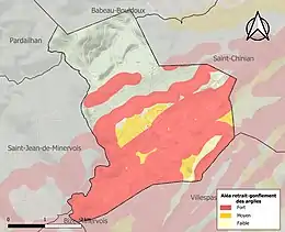 Le retrait-gonflement des sols argileux est susceptible d'engendrer des dommages importants aux bâtiments en cas d’alternance de périodes de sécheresse et de pluie. 64,3 % de la superficie communale est en aléa moyen ou fort (59,3 % au niveau départemental et 48,5 % au niveau national). Sur les 172 bâtiments dénombrés sur la commune en 2019, 169 sont en aléa moyen ou fort, soit 98 %, à comparer aux 85 % au niveau départemental et 54 % au niveau national. Une cartographie de l'exposition du territoire national au retrait gonflement des sols argileux est disponible sur le site du BRGM[22],[Carte 2].