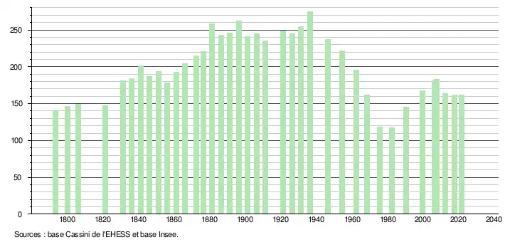 L'évolution du nombre d'habitants est connue à travers les recensements de la population effectués dans la commune depuis 1793. Pour les communes de moins de 10 000 habitants, une enquête de recensement portant sur toute la population est réalisée tous les cinq ans, les populations légales des années intermédiaires étant quant à elles estimées par interpolation ou extrapolation[32]. Pour la commune, le premier recensement exhaustif entrant dans le cadre du nouveau dispositif a été réalisé en 2007[33].