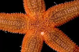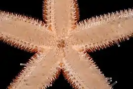 L'anus est situé au centre du disque central (appelé apex), sur la face dorsale : il est difficile à voir, et est situé à proximité du madréporite. Au centre de la face orale se trouve la bouche. Chaque bras comprend sur la face inférieure une gouttière bordée de podia qui permettent le déplacement ; au bout des bras se trouvent aussi de minuscules yeux rudimentaires[1].