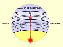 - placer la règle dans l'alignement du Soleil situé à l'entrée du signe du Cancer[4] ;