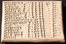 Une autre catégorie majeure de documents astronomiques cunéiformes sont les « éphémérides » (akkadien tērsītu ?), qui documentent l'essor et l'apogée de l'astronomie prédictive mathématique[51]. Il s'agit de tables dont les colonnes rapportent les dates ou positions (dans le zodiaque) de phénomènes périodiques lunaires ou planétaires donnés (nouvelles lunes, éclipses, levers et couchers de planètes, points stationnaires, etc.), employant deux systèmes de modèles différents pour le calcul des déplacements (une progression par paliers à différentes vitesses pour le système A, une progression linéaire à vitesse constante pour le système B). Un autre type de texte documentant l'astronomie mathématique sont les « textes de procédure », décrivant les méthodes de calcul employées pour les éphémérides, est encore mal connu[52],[53],.