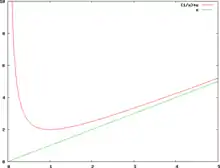 Courbe d'équation y = 1+4(x2 – 1)/x4 et sa droite asymptote (d) : y = 1. Courbe et droite se rencontrent pour x = 1.