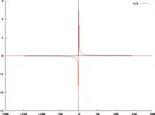 Courbe d'équation y = 1+E(6/x)/3 (où E désigne la fonction partie entière) et sa droite asymptote (d) : y = 1. Courbe et droite finissent confondues.