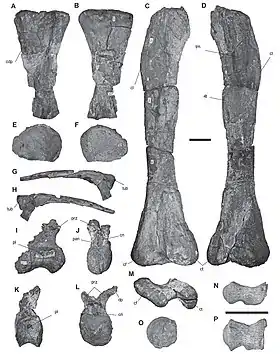 Le fémur découvert est plus gracile que les autres os des membres, ce qui indique l'animal possédait des avait des membres antérieurs plus forts que les membres arrière. Il mesure 1,10 m de long et montre un quatrième trochanter bien développé[1].
