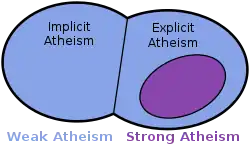 L'athéisme négatif, également appelé athéisme faible et athéisme doux, est un type d'athéisme où une personne ne croit en l'existence d'aucune divinité mais n'affirme pas explicitement qu'il n'y en a pas. L'athéisme positif, également appelé athéisme fort et athéisme dur, est la forme d'athéisme qui affirme en outre qu'aucune divinité n'existe[1],[2],[3].