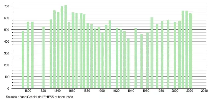 L'évolution du nombre d'habitants est connue à travers les recensements de la population effectués dans la commune depuis 1793. Pour les communes de moins de 10 000 habitants, une enquête de recensement portant sur toute la population est réalisée tous les cinq ans, les populations légales des années intermédiaires étant quant à elles estimées par interpolation ou extrapolation[24]. Pour la commune, le premier recensement exhaustif entrant dans le cadre du nouveau dispositif a été réalisé en 2005[25].