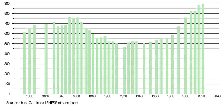 L'évolution du nombre d'habitants est connue à travers les recensements de la population effectués dans la commune depuis 1793. Pour les communes de moins de 10 000 habitants, une enquête de recensement portant sur toute la population est réalisée tous les cinq ans, les populations légales des années intermédiaires étant quant à elles estimées par interpolation ou extrapolation[27]. Pour la commune, le premier recensement exhaustif entrant dans le cadre du nouveau dispositif a été réalisé en 2006[28].