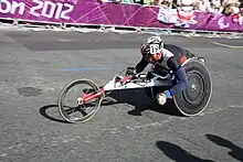 Un athlète lors de l'épreuve du marathon en fauteuil (T54) aux jeux paralympiques de Londres le 9 septembre 2012