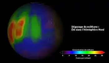 Des traces de méthane, en parties par milliard, ont été découvertes dans l'atmosphère de Mars par une équipe au Goddard Space Flight Center de la NASA en 2003[7],[25]. La présence de méthane sur Mars fait toutefois débat ; en effet du méthane a été détecté à la fois au sol par Curiosity et depuis l'espace par Mars Express en juin 2013 au niveau de cratère Gale avec une concentration de 15,5 ± 2,5 ppb[26] mais il s'agit d'un événement unique et la sonde ExoMars Trace Gas Orbiter n'a pas détecté de méthane dans l'atmosphère martienne malgré une sensibilité des instruments de l'ordre de 0,05 ppb[27].