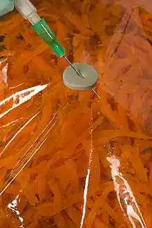 - un emballage actif, par l'utilisation de modificateur de concentration de gaz, d'absorbeur (d'oxygène généralement) ou de relargueurs (dioxyde de carbone)[2].