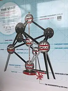 C’est un édifice à mi-chemin entre la sculpture et l’architecture qui culmine à 102 m, dont la masse en 1958 est de 2 400 tonnes (2 500 tonnes en 2006). Il se compose d’une charpente d’acier et de trois piliers bipodes portant neuf sphères de 18 mètres de diamètre pour environ 250 tonnes (une à chacune des 8 points et une au milieu) reliées entre elles par 20 tubes de 3,3 mètres de diamètre (12 de 29 mètres de long pour les arêtes du cube et 2 tubes de 23 mètres de long pour les 4 diagonales) et revêtues, à l'origine, d’aluminium.