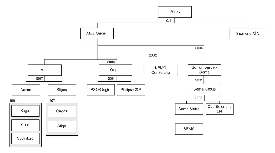 | Dates clés | 2004 : Acquisition de Schlumberger Sema 2011 : Acquisition de SIS (Siemens) 2014 : Acquisition de Bull et Xerox ITO |