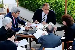 Le , à Genève, les ministres des Affaires étrangères John Kerry et Sergueï Lavrov annoncent la conclusion d'un accord entre les États-Unis et la Russie sur un plan d'élimination des armes chimiques syriennes[149],[150]. Le même jour, la Syrie présente son dossier d'adhésion à l'OIAC[149]. L'accord est salué par la France et le Royaume-Uni, mais rejeté par le général Selim Idriss, le commandant en chef de l'Armée syrienne libre[149].