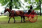 - la bride : supporte le mors auquel les guides sont attachées. La bride est munie d'œillères pour que le cheval ne voie pas sa propre voiture. Un mors adapté est employé, l'un des plus communs étant le mors Liverpool ;