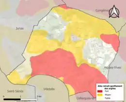 Le retrait-gonflement des sols argileux est susceptible d'engendrer des dommages importants aux bâtiments en cas d’alternance de périodes de sécheresse et de pluie. 72,8 % de la superficie communale est en aléa moyen ou fort (67,5 % au niveau départemental et 48,5 % au niveau national). Sur les 1 250 bâtiments dénombrés sur la commune en 2019, 652 sont en aléa moyen ou fort, soit 52 %, à comparer aux 90 % au niveau départemental et 54 % au niveau national. Une cartographie de l'exposition du territoire national au retrait gonflement des sols argileux est disponible sur le site du BRGM[22],[Carte 2].