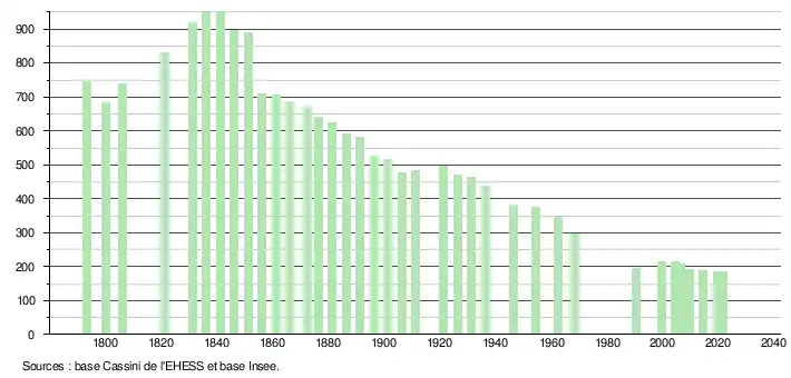 L'évolution du nombre d'habitants est connue à travers les recensements de la population effectués dans la commune depuis 1793. Pour les communes de moins de 10 000 habitants, une enquête de recensement portant sur toute la population est réalisée tous les cinq ans, les populations légales des années intermédiaires étant quant à elles estimées par interpolation ou extrapolation[14]. Pour la commune, le premier recensement exhaustif entrant dans le cadre du nouveau dispositif a été réalisé en 2004[15].