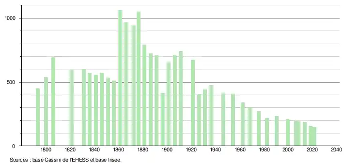 L'évolution du nombre d'habitants est connue à travers les recensements de la population effectués dans la commune depuis 1793. Pour les communes de moins de 10 000 habitants, une enquête de recensement portant sur toute la population est réalisée tous les cinq ans, les populations légales des années intermédiaires étant quant à elles estimées par interpolation ou extrapolation[13]. Pour la commune, le premier recensement exhaustif entrant dans le cadre du nouveau dispositif a été réalisé en 2008[14].