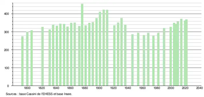 L'évolution du nombre d'habitants est connue à travers les recensements de la population effectués dans la commune depuis 1793. Pour les communes de moins de 10 000 habitants, une enquête de recensement portant sur toute la population est réalisée tous les cinq ans, les populations légales des années intermédiaires étant quant à elles estimées par interpolation ou extrapolation[18]. Pour la commune, le premier recensement exhaustif entrant dans le cadre du nouveau dispositif a été réalisé en 2004[19].