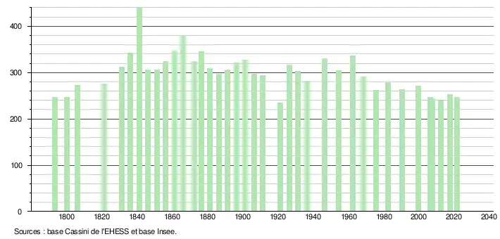 L'évolution du nombre d'habitants est connue à travers les recensements de la population effectués dans la commune depuis 1793. Pour les communes de moins de 10 000 habitants, une enquête de recensement portant sur toute la population est réalisée tous les cinq ans, les populations légales des années intermédiaires étant quant à elles estimées par interpolation ou extrapolation[24]. Pour la commune, le premier recensement exhaustif entrant dans le cadre du nouveau dispositif a été réalisé en 2007[25].