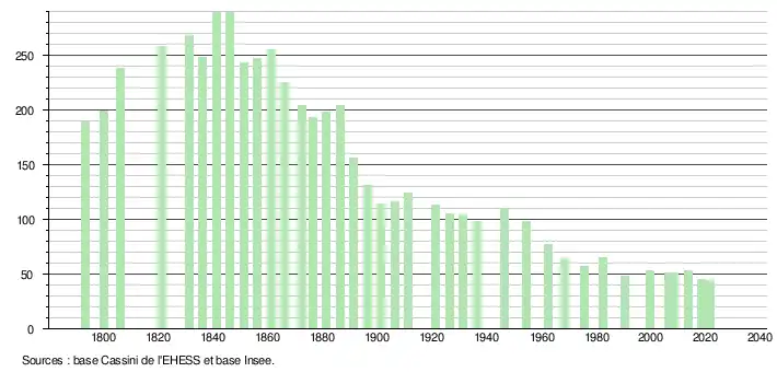 L'évolution du nombre d'habitants est connue à travers les recensements de la population effectués dans la commune depuis 1793. Pour les communes de moins de 10 000 habitants, une enquête de recensement portant sur toute la population est réalisée tous les cinq ans, les populations légales des années intermédiaires étant quant à elles estimées par interpolation ou extrapolation[44]. Pour la commune, le premier recensement exhaustif entrant dans le cadre du nouveau dispositif a été réalisé en 2008[45].