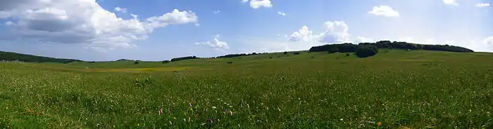 La région de l'Aubrac ou monts d'Aubrac ou aussi plateau de l'Aubrac est une zone située à cheval sur les départements de la Lozère, du Cantal et de l'Aveyron. Elle est délimitée au sud par le Lot, au nord par la Truyère et à l'est par la Colagne. Le massif culmine au sud à 1 469 m au signal de Mailhebiau. C'est un massif volcanique relativement ancien (6 à 9 millions d'années[Note 1]) par rapport aux volcans de la chaîne des Puys qui eux, n'ont que quelques milliers à dizaines de milliers d'années. Il prend la forme d'une échine basaltique allongée (30 km de long), de direction nord-ouest/sud-est, surmontant un socle granitique (laccolite de la Margeride), et issue soit d'un volcanisme de type fissural (rift) soit, selon les auteurs les plus récents, de plusieurs volcans de type hawaïen (volcan rouge) très rapprochés les uns des autres[2]. Les laves émises sont basaltiques ou de composition proche (basanite, trachy-basalte, téphrite…). On peut toutefois trouver localement des traces d'éruptions plus violentes, comme des pyroclastites sous forme de tufs ou de brèches[2], en particulier sur les sommets autour d'Aubrac et à Mailhebiau.