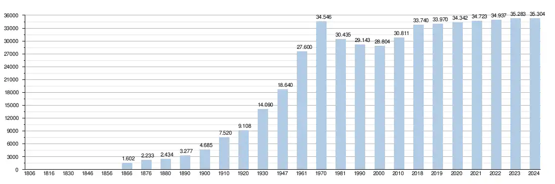 | Habitants | 28 804 | 30 811 | 33 740 | 33 970 | 34 342 | 34 805 | 34 937 | 35 283 | 35 304 | ||||||||||||||||||||