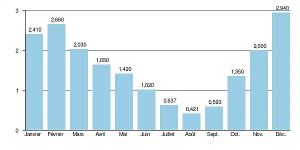 Les crues peuvent être importantes compte tenu de la petitesse du bassin versant. Les QIX 2 et QIX 5 valent respectivement 22 et 30 m3/s. Le QIX 10 est de 34 m3/s, le QIX 20 de 39 m3/s, tandis que le QIX 50 se monte à 45 m3/s[3].