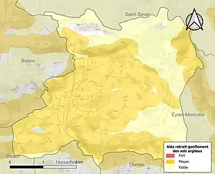 Le retrait-gonflement des sols argileux est susceptible d'engendrer des dommages importants aux bâtiments en cas d’alternance de périodes de sécheresse et de pluie. 69 % de la superficie communale est en aléa moyen ou fort (19,2 % au niveau départemental et 48,5 % au niveau national). Sur les 188 bâtiments dénombrés sur la commune en 2019, 137 sont en aléa moyen ou fort, soit 73 %, à comparer aux 17 % au niveau départemental et 54 % au niveau national. Une cartographie de l'exposition du territoire national au retrait gonflement des sols argileux est disponible sur le site du BRGM[31],[Carte 2].