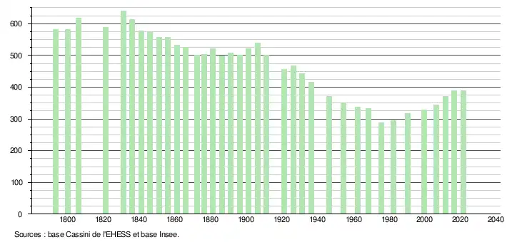 L'évolution du nombre d'habitants est connue à travers les recensements de la population effectués dans la commune depuis 1793. Pour les communes de moins de 10 000 habitants, une enquête de recensement portant sur toute la population est réalisée tous les cinq ans, les populations légales des années intermédiaires étant quant à elles estimées par interpolation ou extrapolation[41]. Pour la commune, le premier recensement exhaustif entrant dans le cadre du nouveau dispositif a été réalisé en 2006[42].