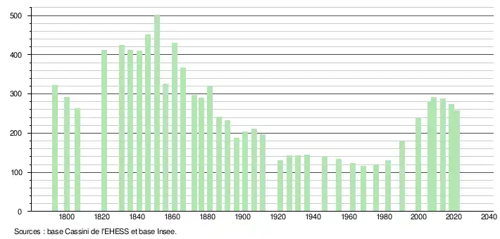 L'évolution du nombre d'habitants est connue à travers les recensements de la population effectués dans la commune depuis 1793. Pour les communes de moins de 10 000 habitants, une enquête de recensement portant sur toute la population est réalisée tous les cinq ans, les populations légales des années intermédiaires étant quant à elles estimées par interpolation ou extrapolation[52]. Pour la commune, le premier recensement exhaustif entrant dans le cadre du nouveau dispositif a été réalisé en 2008[53].