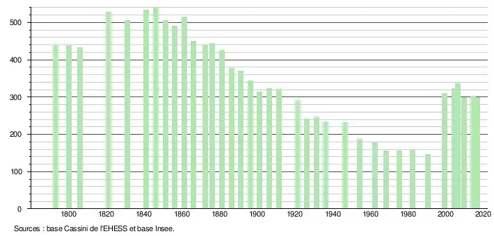 L'évolution du nombre d'habitants est connue à travers les recensements de la population effectués dans la commune depuis 1793. Pour les communes de moins de 10 000 habitants, une enquête de recensement portant sur toute la population est réalisée tous les cinq ans, les populations légales des années intermédiaires étant quant à elles estimées par interpolation ou extrapolation[17]. Pour la commune, le premier recensement exhaustif entrant dans le cadre du nouveau dispositif a été réalisé en 2004[18].