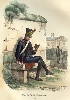 Auguste Comte fait son entrée à l’École polytechnique le [11]. Avec le grade de caporal, il bénéficie de l'enseignement des scientifiques les plus renommés de leur discipline[12]: Louis Poinsot, François Arago, Louis-Jacques Thénard, Alexis Petit ou encore Augustin Cauchy. Malgré un caractère quelque peu dissipé, il se distingue là encore aux yeux de ses professeurs[13]. Un très fort esprit de corps se développe au sein de sa promotion : ses camarades le surnomment Sganarelle, en raison de son don pour la satire, ou le Philosophe.