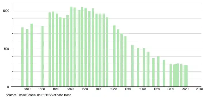 L'évolution du nombre d'habitants est connue à travers les recensements de la population effectués dans la commune depuis 1793. Pour les communes de moins de 10 000 habitants, une enquête de recensement portant sur toute la population est réalisée tous les cinq ans, les populations légales des années intermédiaires étant quant à elles estimées par interpolation ou extrapolation[21]. Pour la commune, le premier recensement exhaustif entrant dans le cadre du nouveau dispositif a été réalisé en 2004[22].