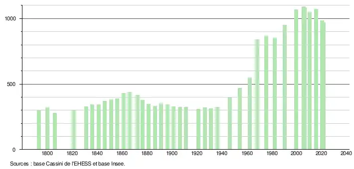 L'évolution du nombre d'habitants est connue à travers les recensements de la population effectués dans la commune depuis 1793. Pour les communes de moins de 10 000 habitants, une enquête de recensement portant sur toute la population est réalisée tous les cinq ans, les populations légales des années intermédiaires étant quant à elles estimées par interpolation ou extrapolation[16]. Pour la commune, le premier recensement exhaustif entrant dans le cadre du nouveau dispositif a été réalisé en 2005[17].
