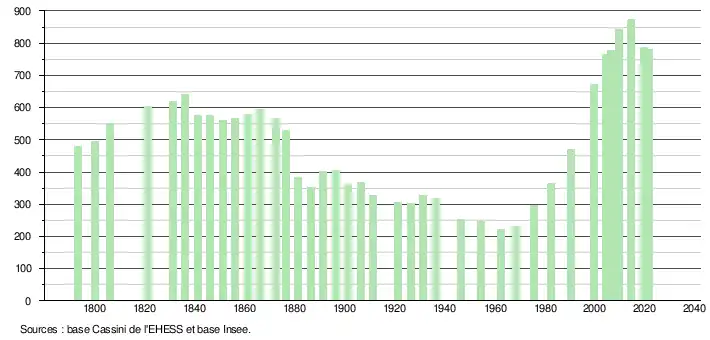 L'évolution du nombre d'habitants est connue à travers les recensements de la population effectués dans la commune depuis 1793. Pour les communes de moins de 10 000 habitants, une enquête de recensement portant sur toute la population est réalisée tous les cinq ans, les populations légales des années intermédiaires étant quant à elles estimées par interpolation ou extrapolation[18]. Pour la commune, le premier recensement exhaustif entrant dans le cadre du nouveau dispositif a été réalisé en 2004[19].
