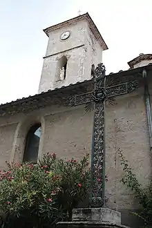 Croix et clocher de l'église Saint-Martin d'Aulas. - Temple protestant bâti en 1840 portant les inscriptions ultérieurement rajoutées : « Liberté, Égalité, Fraternité » et « République Française ».