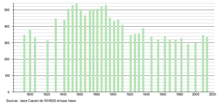 L'évolution du nombre d'habitants est connue à travers les recensements de la population effectués dans la commune depuis 1793. À partir du , les populations légales des communes sont publiées annuellement dans le cadre d'un recensement qui repose désormais sur une collecte d'information annuelle, concernant successivement tous les territoires communaux au cours d'une période de cinq ans. Pour les communes de moins de 10 000 habitants, une enquête de recensement portant sur toute la population est réalisée tous les cinq ans, les populations légales des années intermédiaires étant quant à elles estimées par interpolation ou extrapolation[12]. Pour la commune, le premier recensement exhaustif entrant dans le cadre du nouveau dispositif a été réalisé en 2008[13],[Note 3].