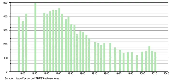 L'évolution du nombre d'habitants est connue à travers les recensements de la population effectués dans la commune depuis 1793. Pour les communes de moins de 10 000 habitants, une enquête de recensement portant sur toute la population est réalisée tous les cinq ans, les populations légales des années intermédiaires étant quant à elles estimées par interpolation ou extrapolation[16]. Pour la commune, le premier recensement exhaustif entrant dans le cadre du nouveau dispositif a été réalisé en 2006[17].