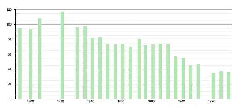 L’histoire démographique d’Aurent est marquée par une période d’« étale » où la population reste relativement stable à un niveau élevé, grossièrement pendant la première moitié du XIXe siècle. L’exode rural provoque ensuite un mouvement de recul démographique de longue durée. Dès 1896, la commune enregistre la perte de la moitié de sa population par rapport au maximum historique de 1821[7]. Le mouvement de baisse continue ensuite, et pousse à la fusion avec la commune de Braux, puis de Castellet-lès-Sausses.